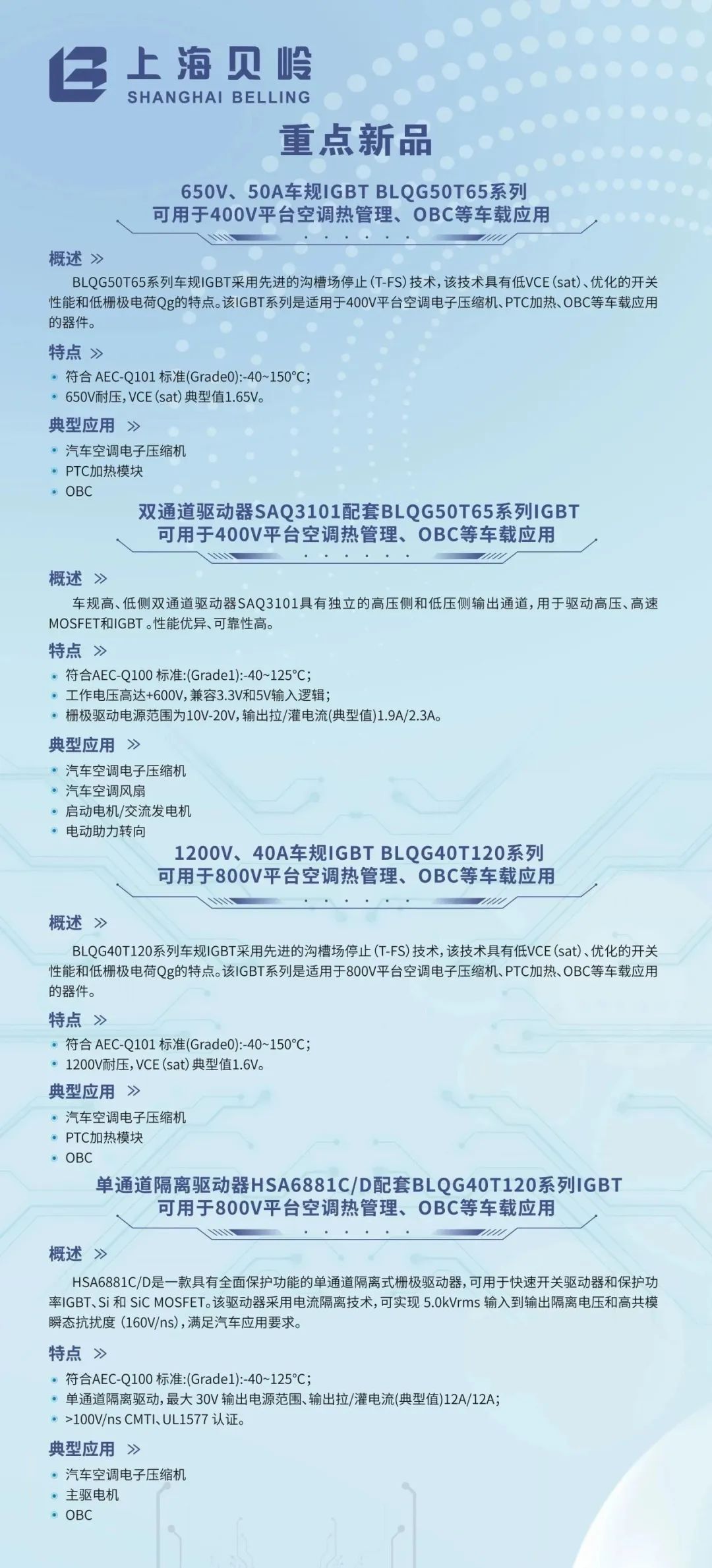 上海贝岭深耕车规功率器件领域,打造了覆盖新能源汽车全场景的解决方案,核心产品包括: