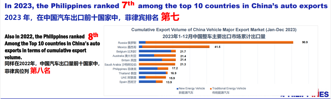 关于市场优势,佩尼亚兰达表示:“菲律宾拥有显著的本地市场和全球市场的通达能力。我们的年度汽车市场为47.5万辆,是中国汽车的主要出口市场之一。同时,菲律宾市场正呈现出强劲的增长势头,预计电动汽车销售将增长至少10%。到2040年,菲律宾市场将需要约600万辆电动汽车和14.7万个充电站。”