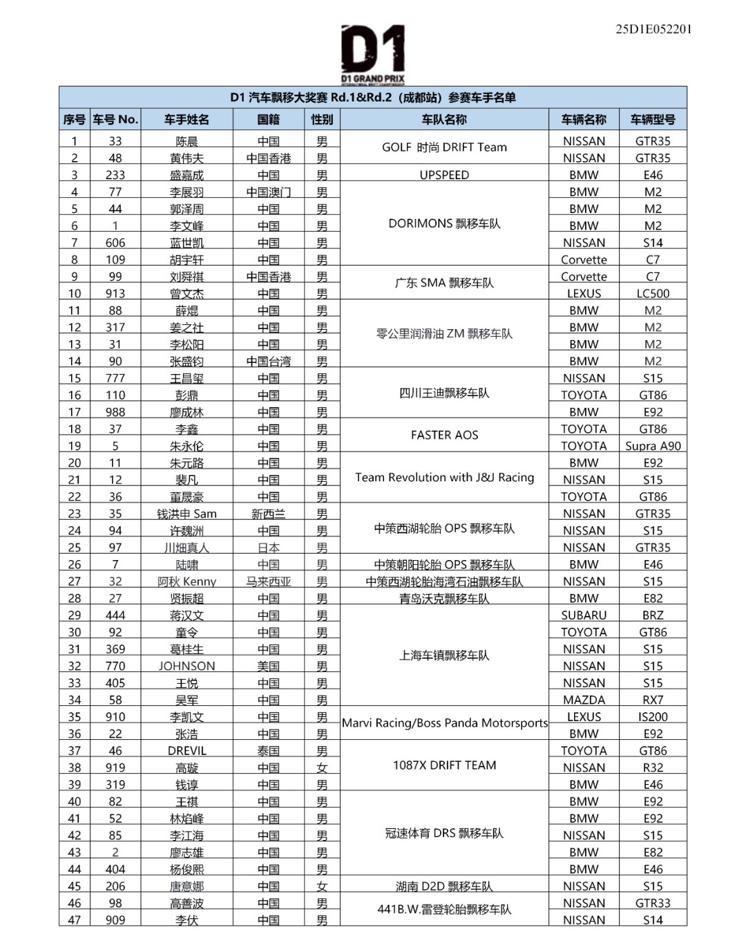 2025 D1汽车飘移大奖赛(成都站)参赛车手名单
